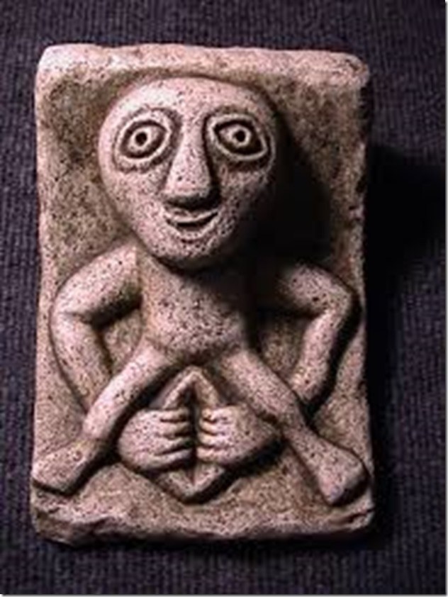 Cruise the old churches of Europe and you’re sure to run into the Sheela-Na-Gig. She’s found on arches and carved in stones. Her huge head, staring eyes and her hands reaching down between her wide open legs to spread her swollen and oversized womanhood suggest more prostitution than protection. The Sheela-Na-Gig are said to keep evil away.